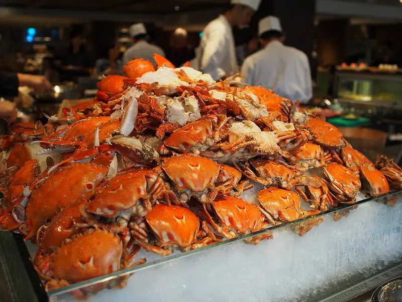 ▲三點蟹、貽貝、鮮蝦等海鮮料理吃到飽,晶華酒店柏麗廳人氣度最高的料理區。(圖/WalkerLand)