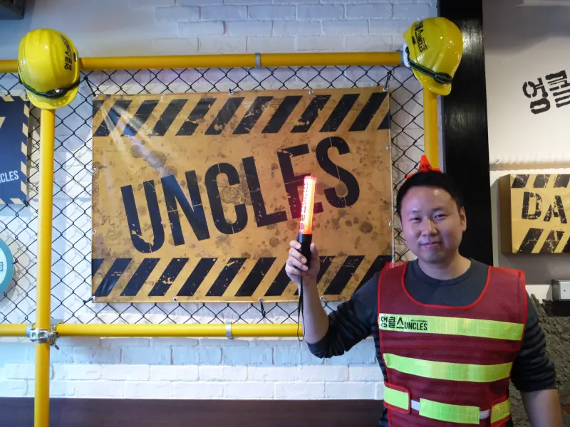 ▲Uncles炸魷魚辣炒年糕專賣店吃飯全副裝備,營造一種工地風的氛圍,只要揮動指揮棒,服務人員會馬上來幫你服務。(圖/WalkerLand窩客島 整理提供)