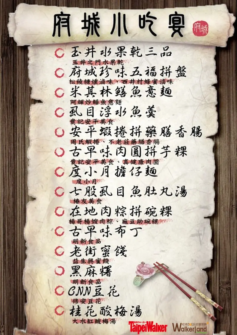 台南美食「府城小吃宴」於12月12日~13日推出整合台南16家知名小吃的菜式,包含炒鱔魚、浮水魚羹、藥膳香腸、擔仔麵、蝦捲、滷味、肉粽、碗粿、虱目魚丸湯、酸梅湯、蜜餞、豆花、布丁等等,民眾無須四處奔走,即可一次享用,自10月26日(一)中午12:00起於活動官網開放預訂。(▼圖 / 臺南市政府觀光旅遊局 旅遊服務科 / Walker Land 整理提供)![]()