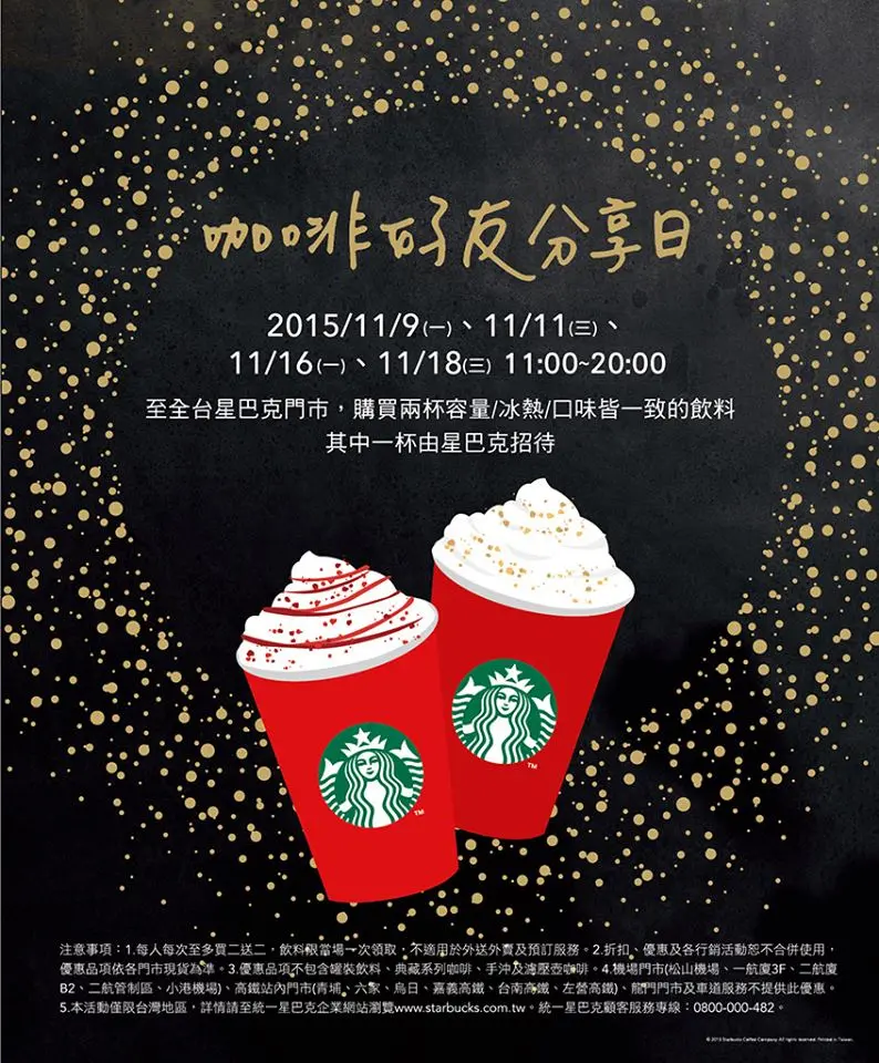 星巴克咖啡好友分享日2015/11/9(一)、11/11(三)、11/16(一)、11/18(三),時間是在這四天的11:00-20:00,於活動限定時間至全台星巴克門市,購買兩杯容量/冰熱/口味皆一致的飲料,其中一杯由星巴克招待!快邀約好友,選定喜歡喝的飲料。