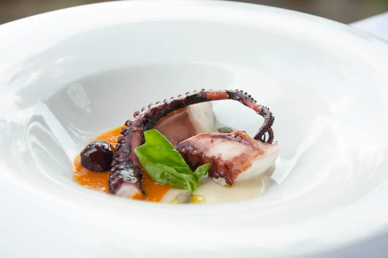 ▲「爐烤Rosso Ibleo酒煮章魚附慢煮奶油洋蔥泥佐番茄酸豆黑橄欖醬汁」特選章魚以Rosso Ibleo酒煮50分鐘,搭配酸豆、黑橄欖、蘿勒葉及番茄等以舒肥法製做成配菜料理,主廚的自創口味將整體的口感提升到極致,獨特而另人驚艷。(圖/維多麗亞酒店)