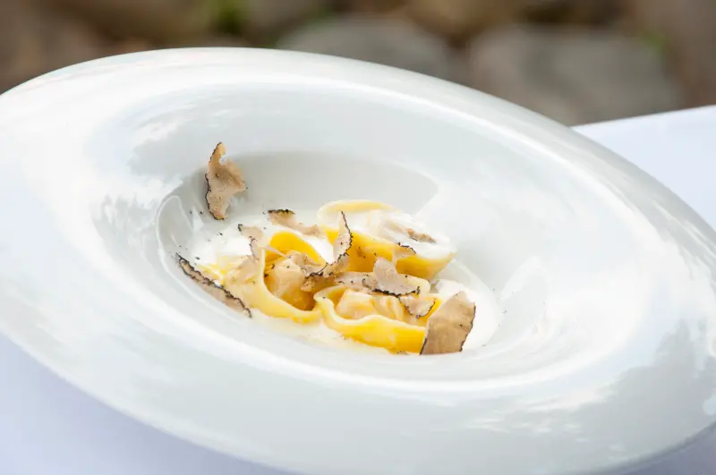 ▲「南瓜乳酪餃子佐熟成36個月帕馬森硬乳酪醬與現刨黑松露」手工麵皮裡面鑲入的是在西西里秋天常吃並經烘烤過的南瓜切丁、瑞卡塔起司(Ricotta Cheese))及熟成36個月的帕馬森硬乳酪,整個豐富了手工餃的濃郁口感。(圖/維多麗亞酒店)