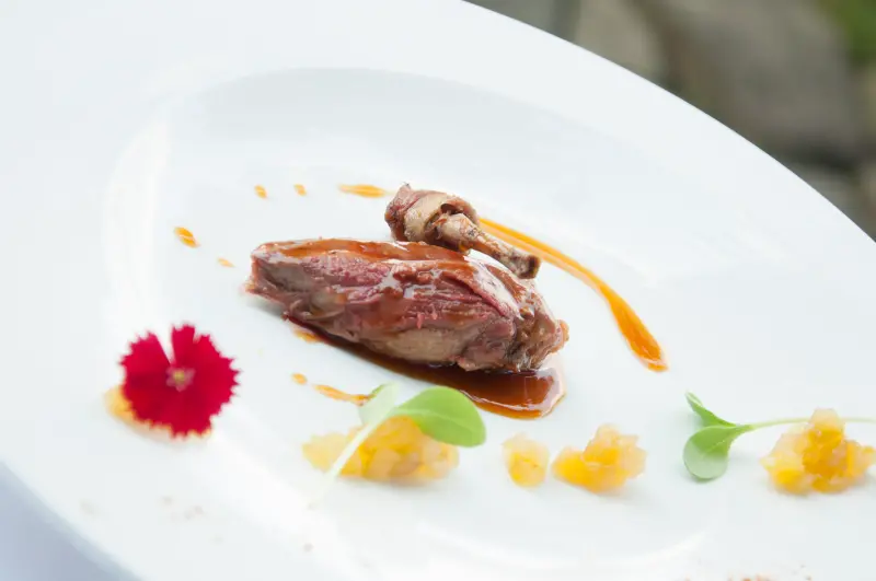 ▲「炙烤乳鴿佐鳳梨醬汁與茄子」乳鴿為義大利北方的一道經典菜色,搭配鳳梨、茄子、青蘋果加糖後微煎炒到焦糖感的風味,再加上橙汁及迷迭香製作的醬汁,帶出整體的鮮香風味。(圖/維多麗亞酒店)