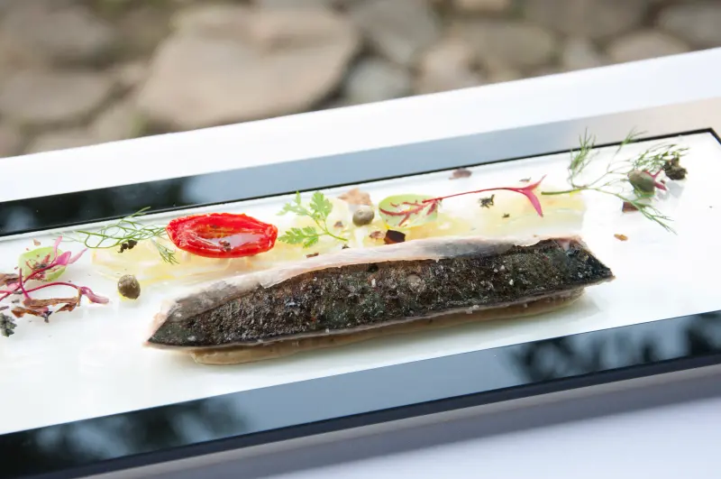 ▲「燒烤鯖魚配煙燻茄子蓉與油封櫻桃番茄」選用新鮮鯖魚與醃製後煙燻的豬頰肉,佐以糖漬檸檬與油封櫻桃番茄平衡整體的口感,呈現具有獨特海洋風味的五星級前菜料理。(圖/維多麗亞酒店)