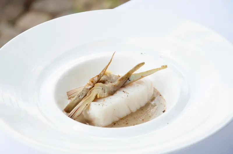 ▲「慢煮低溫鹽漬鱈魚佐朝鮮薊與薰香豆」鱈魚是西西里在聖誕節時會準備的一道經典菜色,配菜的部分則是使用有「貴族食物」、「蔬菜之王」之稱的朝鮮薊及薰香豆,以蔬菜高湯拌煮,滋味獨特、迷人而鮮美。(圖/維多麗亞酒店)