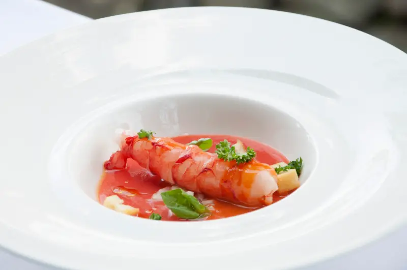 ▲「新鮮香草番茄冷湯配胭脂蝦」將微煎胭脂蝦放入櫻桃番茄熬煮的新鮮番茄冷湯中,口感清爽開胃。(圖/維多麗亞酒店)