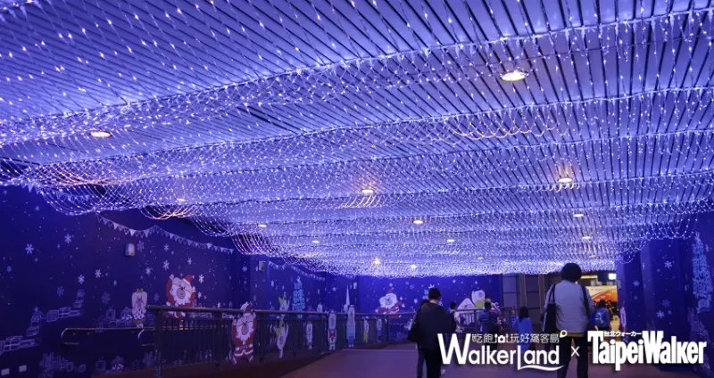 ▲走進板橋車站地下連通道,已掛上滿滿的藍色燈海。(圖/WalkerLand)