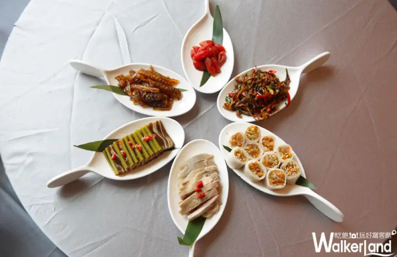 ▲《迎賓六味碟》較特別的千層豬耳凍經燒毛、刮清、滷軟、重壓,並添鋪薄薄一層綠碗豆泥增色而成的,需時一天半,工緻味細,在主廚的觀念中,包括開胃小點,道道都需從頭自製,為了保持對料理不段精進與敏感度,他也在第一線上,將口傳不及的風範,親身展傳至後輩。