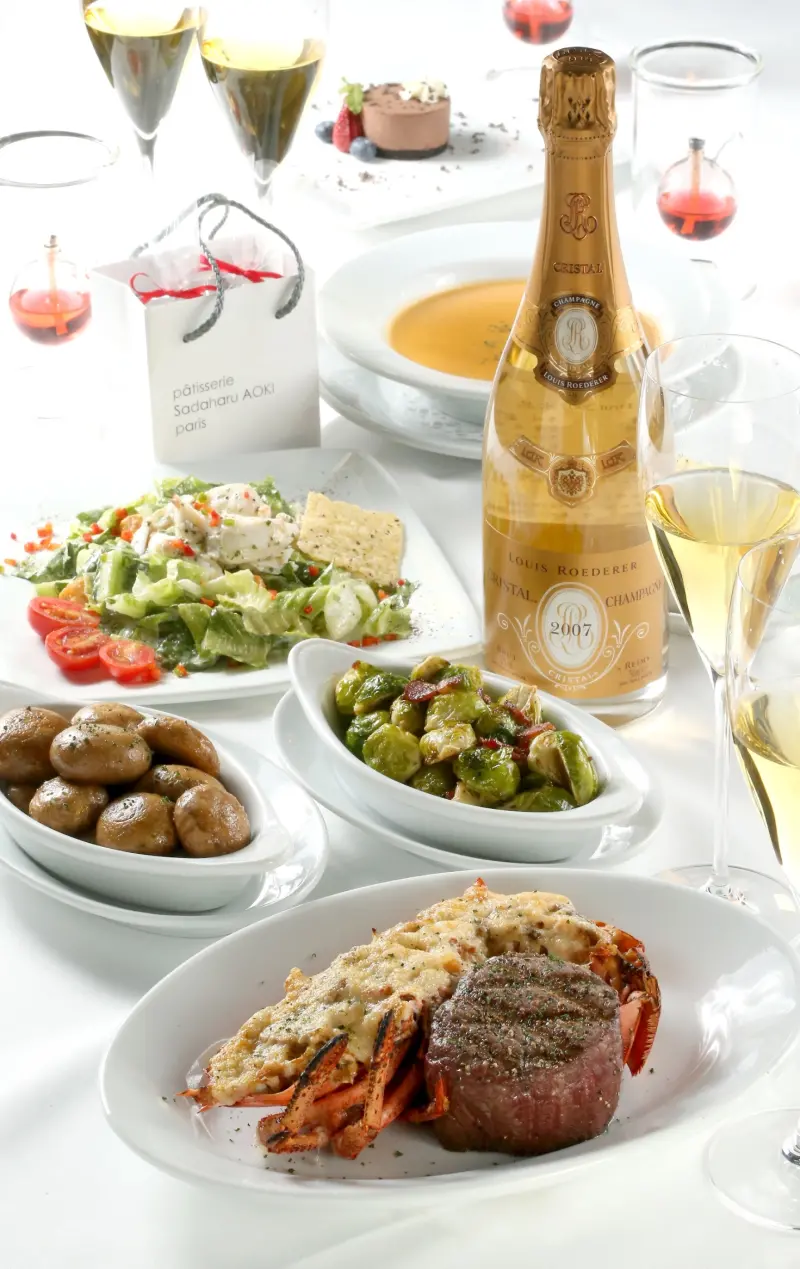 茹絲葵節慶套餐(Holiday Menu 2015),主菜秉持一貫傳統選用產量只占市場不到2%的美國U.S.D.A. Prime頂級牛肉,此次還特別推出菲力牛排搭配法式焗烤波士頓龍蝦的豪華組合。更特選全新料理,美國美食之都紐奧良式蟹肉凱薩沙拉-新鮮爽脆茹絲葵的經典凱薩沙拉,搭配以招牌油醋醬調味肥美多汁的蟹螯肉,讓人一口接一口。餐後以巧克力慕斯起司蛋糕與青木定治禮物,伴您度過美好佳節,同時也為這一場美食饗宴畫下完美句點。