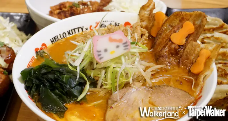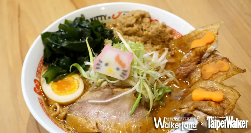 首次推出的「KITTY拉麵」以醬油、芝麻醬、辣麻油、花椒研製出不同以往的豐富層次湯頭,微辣的口感特別適合冬季品嚐,又加上獨家蔬菜味噌絞肉、炙燒五花肉片、叉燒肉片、Kitty魚板、Kitty蝴蝶結紅蘿蔔,食材豐富又澎湃。
