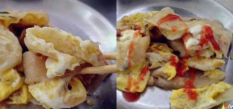 店家的蛋餅是用鐵盤裝著的,很有特色,而且加入了辣醬更好吃!。