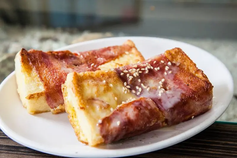 蠻多人推薦的法式培根捲,將厚片吐司裹上蛋液外面再包上培根,在下鐵盤煎至熟。味道吃起來像是早餐店的法國吐司加上煎培根,所以會有法國吐司鬆軟的口感加上培根的香氣。以前都沒想過這兩種東西可以合在一起當早餐,第一次吃到覺得還蠻特別的,還不錯。