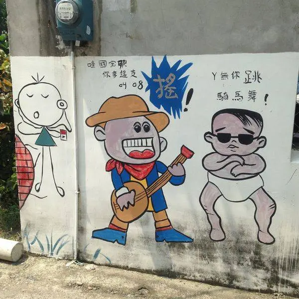 yoyo:成龍集會所的外觀,鮮豔的色彩吸引眾人的目光,不規則的藍色波浪就像是海浪一樣,牆上都是魚類的馬賽克拼貼圖案,這集會所就像是海底龍宮哩。而門口可愛的鳥門神默默的守護的海底龍宮。