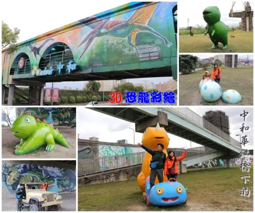 【新北市景點】華中橋下的3D恐龍彩繪近日已大放異彩,趕快牽著你的鐵馬,過來與恐龍小小的約會吧/人行陸橋上有恐龍耶/親子旅遊好好玩/恐龍籃球場/Q版的立體恐龍互動拍照