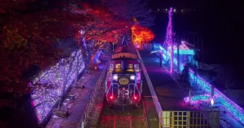 日本最夢幻列車回歸,京都嵯峨野小火車變身銀河列車,1000盞燈光照亮整片紅葉林。