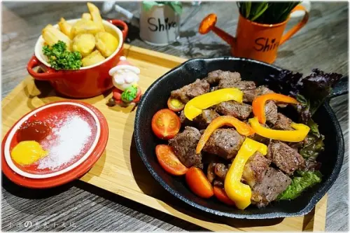 『台中。西屯區』夏爾Shire美式餐廳║中科商圈新選擇,鐵鍋料理讓人愛不釋口,骰子牛肉/人像拉花絕對不能錯過!(寵物友善店)