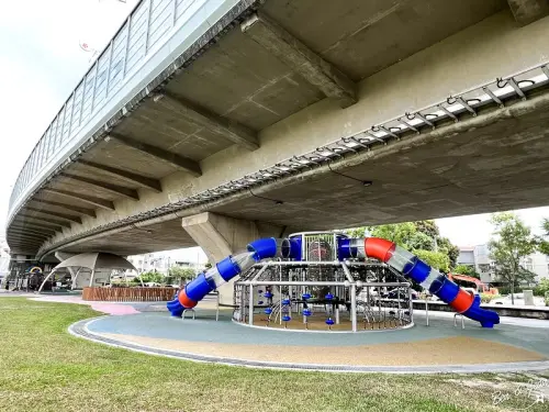 番仔溝公園》橋下機器人全齡遊戲場!無論晴雨天都能玩、飛碟多功能溜滑梯、沙坑、三人跳格子|嘉義親子景點