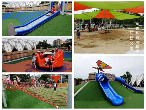台北圓山特色公園 ▶ 花博公園 舞蝶共融遊戲場 ▶ 遊樂設施豐富 台北市最好玩的特色公園 繩索攀爬・無障礙遮陽沙坑・旋轉椅・人工草皮山丘溜滑梯・滾輪溜滑梯・鳥巢鞦韆