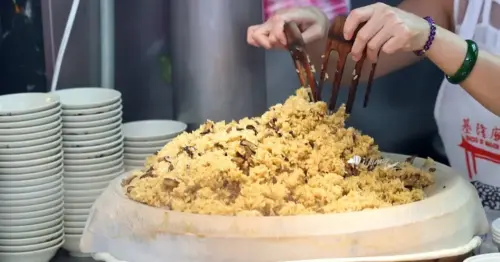 基隆廟口吳記螃蟹羹油飯,五號攤飄香三十年,鮮甜蟹肉配古早味油飯必吃。