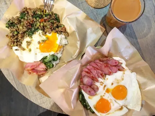 【永和|頂溪站】北蘭阿姨商行_邪惡雙半熟蛋蒜味香腸飯_讓人手嘴停不下來的嘎拋豬肉飯_永和宵夜新朋友