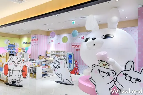 4米高兔兔氣球免費拍!療癒系「呦嘻百分百X懶洋洋喵之助X微笑柴犬」聯合快閃夢時代,超過百款周邊讓粉絲買到不想回家。
