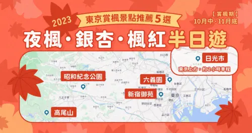 2023東京人氣楓紅名勝排行榜TOP5,夜楓點燈、銀杏、楓紅宣告秋季來臨了。紅葉祭賞楓外還要給你滿滿的秋之美食、美酒大賞。