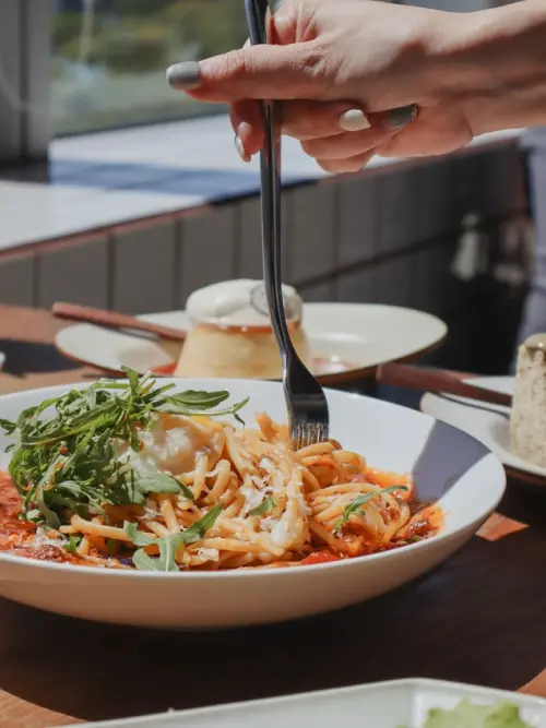 輕鬆享受景觀餐廳的美好,特色義大利麵、焦糖布丁、提拉米蘇奶酒拿鐵