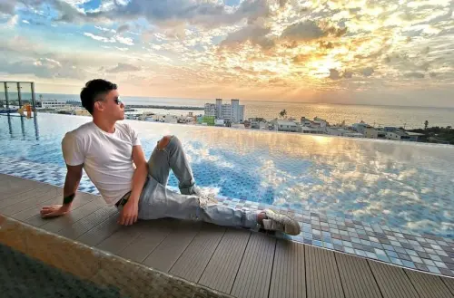 枋客文旅。漂浮在游泳池邊際看海賞夜景。屏東旅遊住宿鄰枋寮火車站