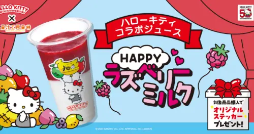 凱蒂貓粉絲集合!Hello Kitty 50周年紀念,聯名日本連鎖果汁店「果琳」,推出覆盆子牛奶。