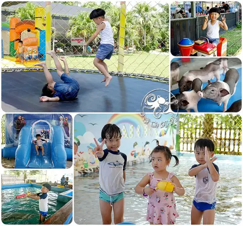 桃園親子景點【五陽城市原創農場】桃園市裡的水陸樂園!$390元BBQ自助火烤吃到飽,水中投籃與水中溜滑梯、可愛小豬、沙坑區、彈跳床、氣墊床、遊戲室!