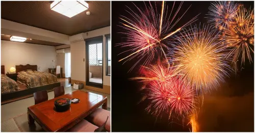 熊本山鹿燈籠祭的美麗煙火從房間就能直接欣賞,溫泉旅館花火房限量18間。