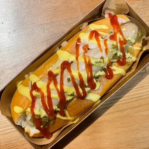 新竹市北區許多新竹人少男少女時代逛街必吃小吃! 大熱狗脆皮多汁。老饕必選雙醬更美味!