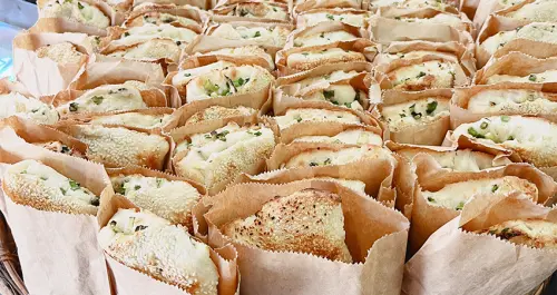 基隆暖暖必吃「萬金缸爐碳烤燒餅」滿滿蔥花超誘人!招牌「五香餅」想吃請提早到。