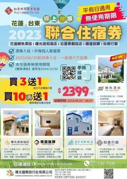 台東線上旅展聯合住宿券,買3送1,買10再送1,2399元/張。