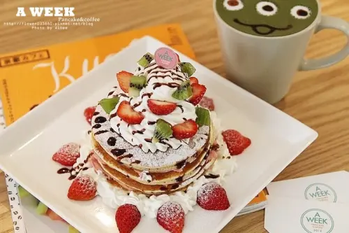 台南 中西區 蒂芬妮藍。少女們~快去呼朋引伴吧!!季節限定草莓馬斯卡彭煎餅,還有可愛小不點拉花、三眼怪拉花 。A WEEK Pancake&coffee 早午餐|下午茶