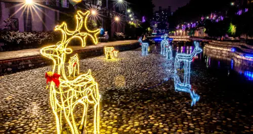 新莊人、蘆洲人下班散步去!中港大排「耶誕麋鹿、1.8公里燈海步道」照亮新莊夜晚,就連「蘆洲鴨母港溝」也變成奇幻粉紫世界。