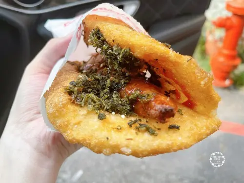 細妹蘿蔔絲餅,台中教育大學西區美食,低調人氣排隊美食,10元香腸,蔥油餅夾酸菜加香腸 - Cyndi loves 享食天堂