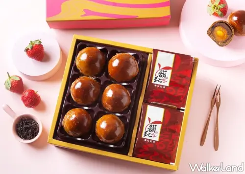 粉金色蛋黃酥!貓茶町首創粉金蛋黃酥「拾捌紅玉」充滿茶香、果香、荔枝酒香及酥香,不僅討好女生的心、也擄獲男生的味。