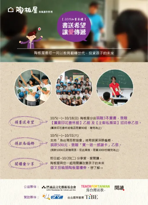 搶救偏鄉教師荒!陶板屋「知書答禮」偏鄉傳愛,捐款就送你買一送一!