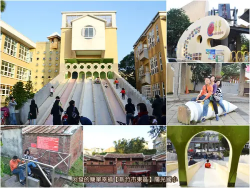 ﹝新竹市東區遊記﹞陽光國小 著名特色小學內兩層樓高彩色瀑布溜滑梯、水彩顏料造型座椅、水泥大水管、三合院、腳踏水車… /造型溜滑梯/新竹免費親子景點