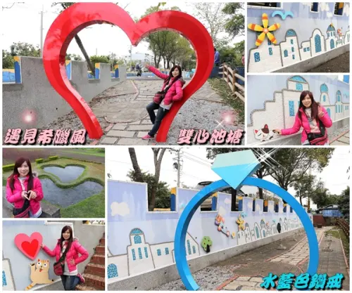 【彰化景點】遇見希臘風~和平社區大村雙心池塘,增添新花樣的藍白色地中海裝置藝術,繞過結婚愛心拱門,戴上水藍色鑽戒,在幸福的國度裡欣喜若狂/結婚愛心拱門/藍白地中海的馬賽克拼貼城牆/水藍色鑽戒/觀賞蓮花