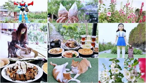 田中蜀葵花藝術季|蜀葵花海中品嚐桶仔雞套餐.窯烤麵包.手拉胚,巨大魷魚遊戲木頭人娃娃藏花海.來彰化田中