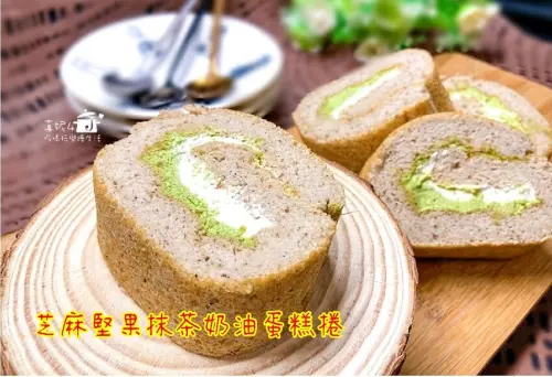 烘焙筆記│芝麻堅果抹茶奶油蛋糕捲,蛋糕質地綿密雙色夾心口感滑顺